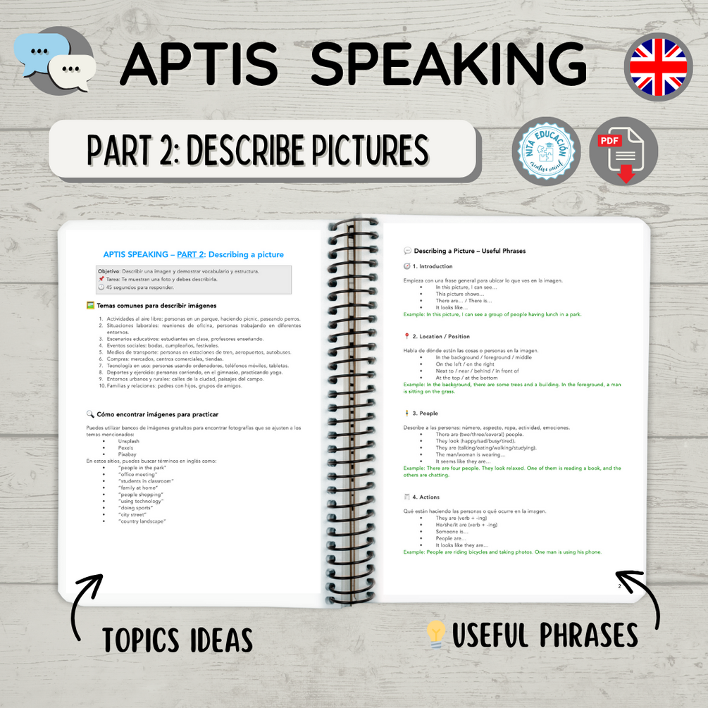 Un recurso claro, práctico y visual para preparar la Parte 2 del Speaking Aptis con confianza. Incluye frases útiles, estructuras clave y ejemplos completos que te ayudarán a describir imágenes de forma natural y organizada. Ideal para clases particulares, academias o autoestudio. 🧠✨