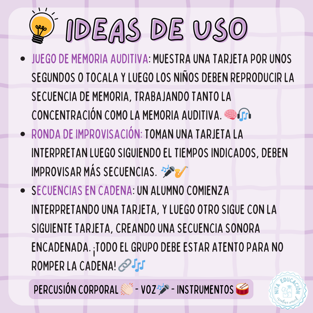 Estas tarjetas son perfectas para trabajar en el aula o en casa, fomentando la escucha activa y el ritmo mientras los niños exploran las diferentes cualidades del sonido, como la intensidad, el timbre, la altura y la duración. 🎶👂