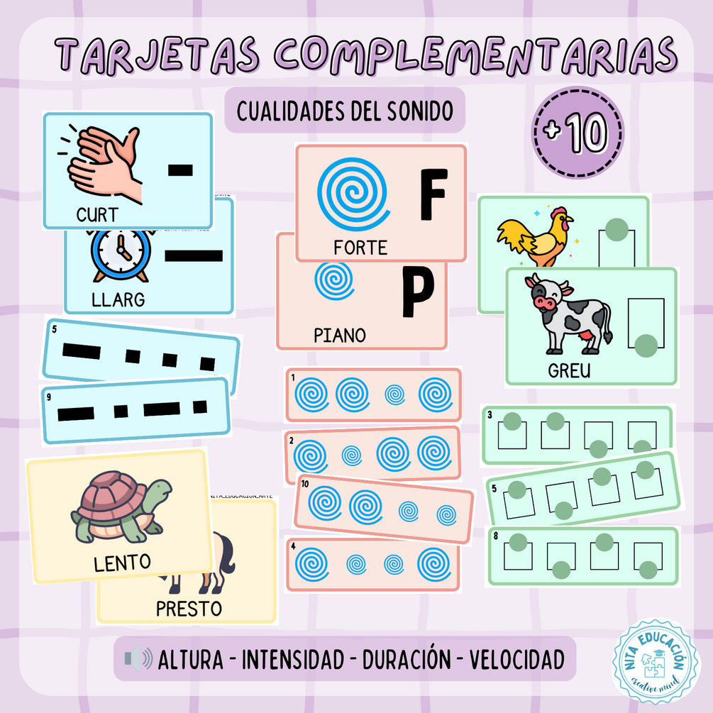 Estas tarjetas son perfectas para trabajar en el aula o en casa, fomentando la escucha activa y el ritmo mientras los niños exploran las diferentes cualidades del sonido, como la intensidad, el timbre, la altura y la duración. 🎶👂