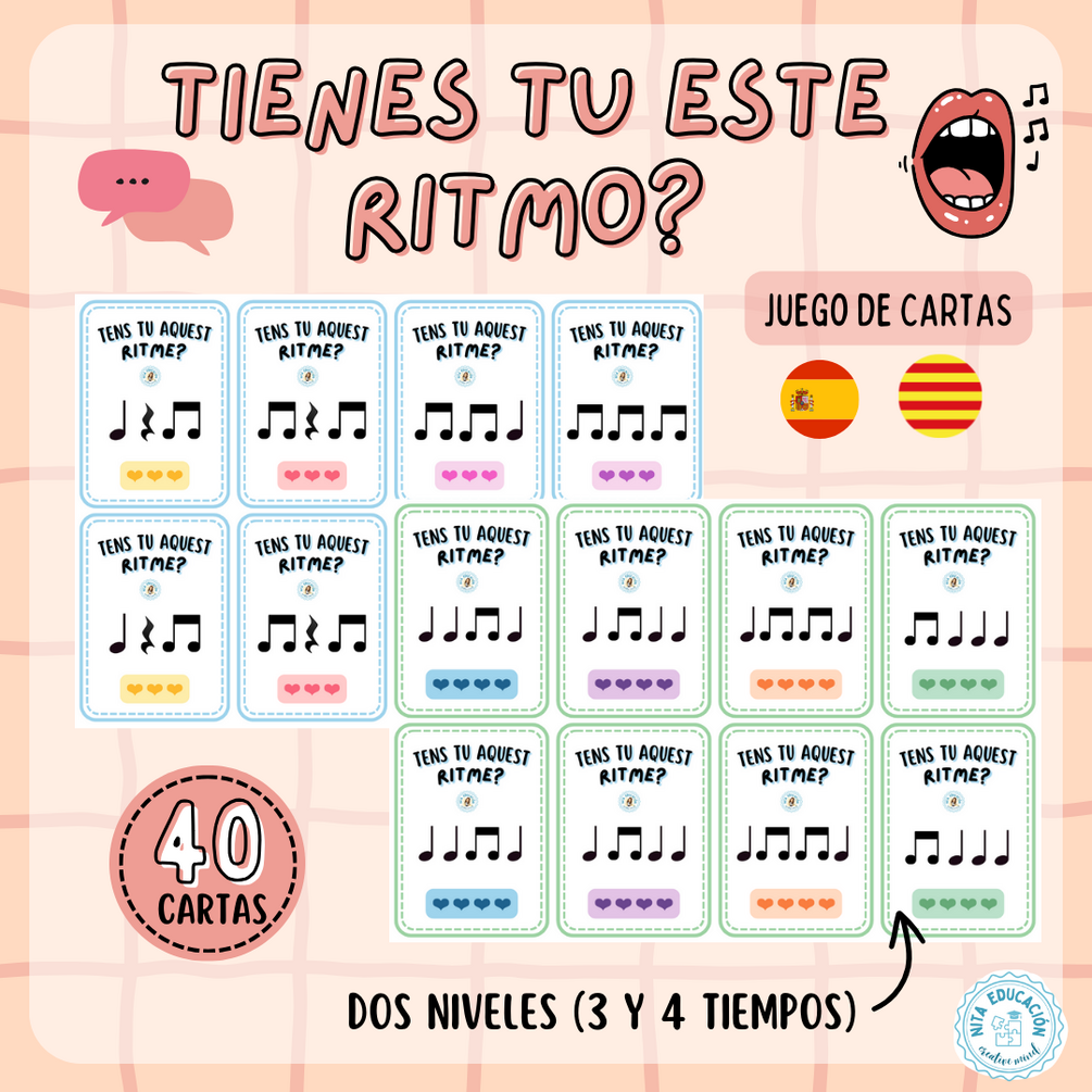 🗣️🎵 “¿Tienes este ritmo?” es un juego de cartas diseñado especialmente para practicar ritmos musicales, percusión corporal e instrumentos. Con 40 cartas (20 diferentes, cada una con su pareja) y dos niveles de dificultad (3 y 4 tiempos), ¡el aprendizaje y la diversión están asegurados! 🌈