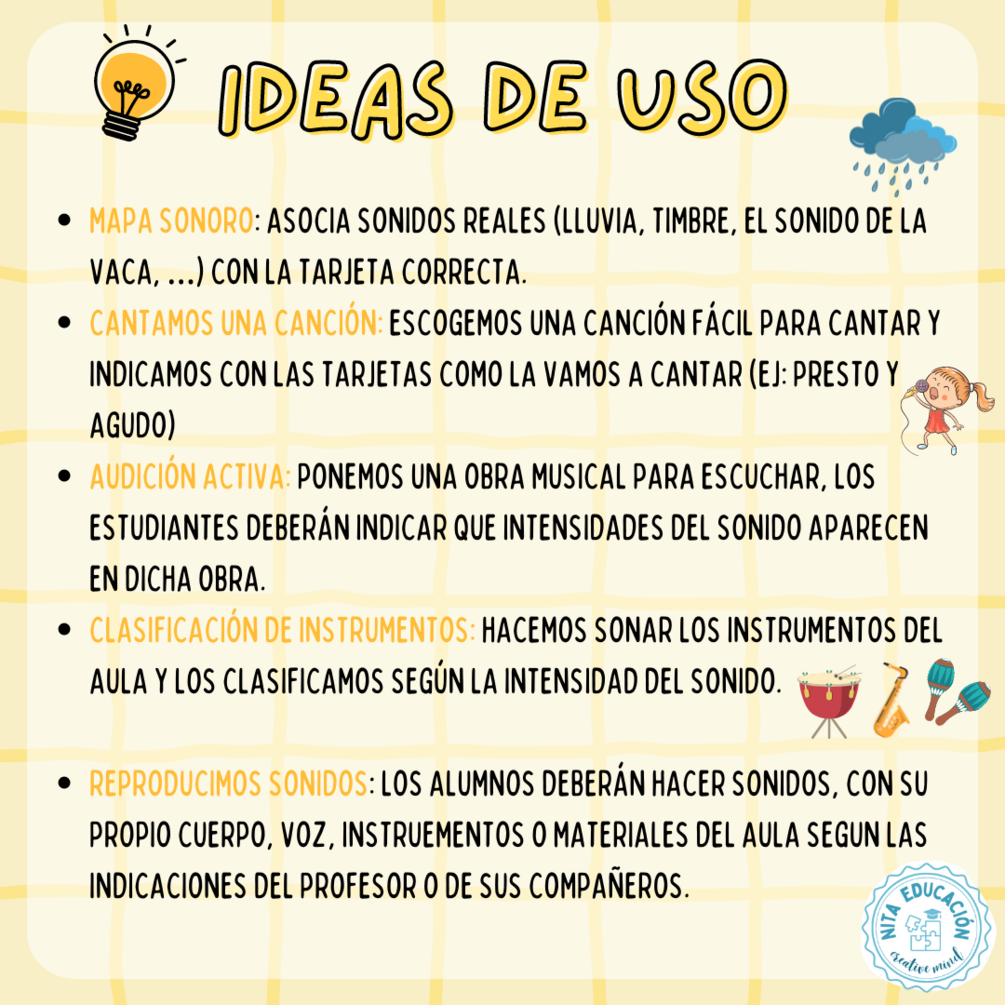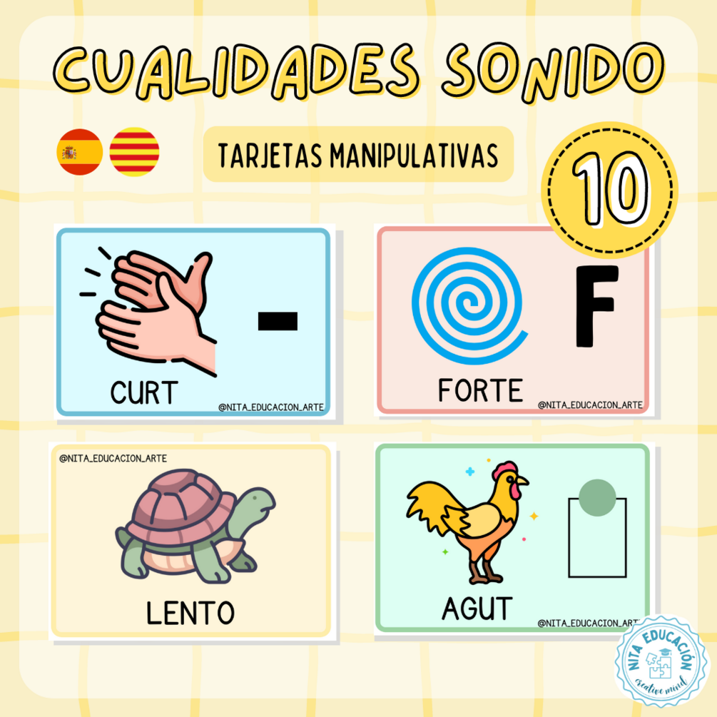 - 10 tarjetas manipulativas con diferentes cualidades del sonido.